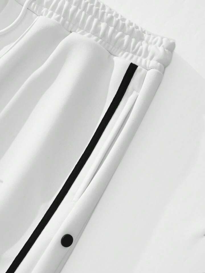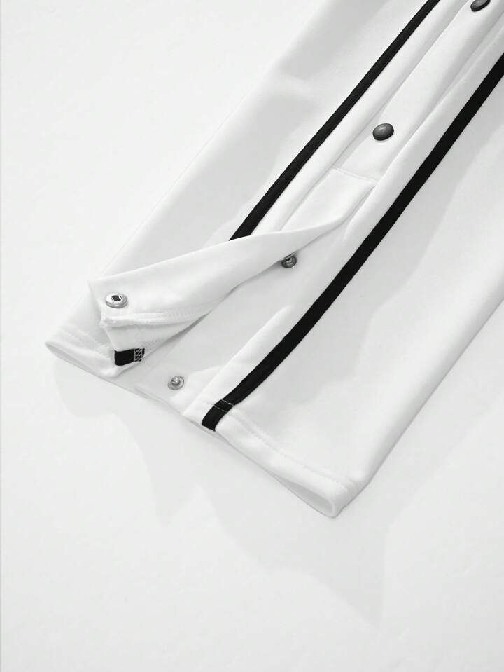Black snap track pants: These pants feature a white vertical stripe down the sides with white snap buttons, giving them a classic athletic look. The snap buttons likely allow for adjustable ventilation or style customization.
